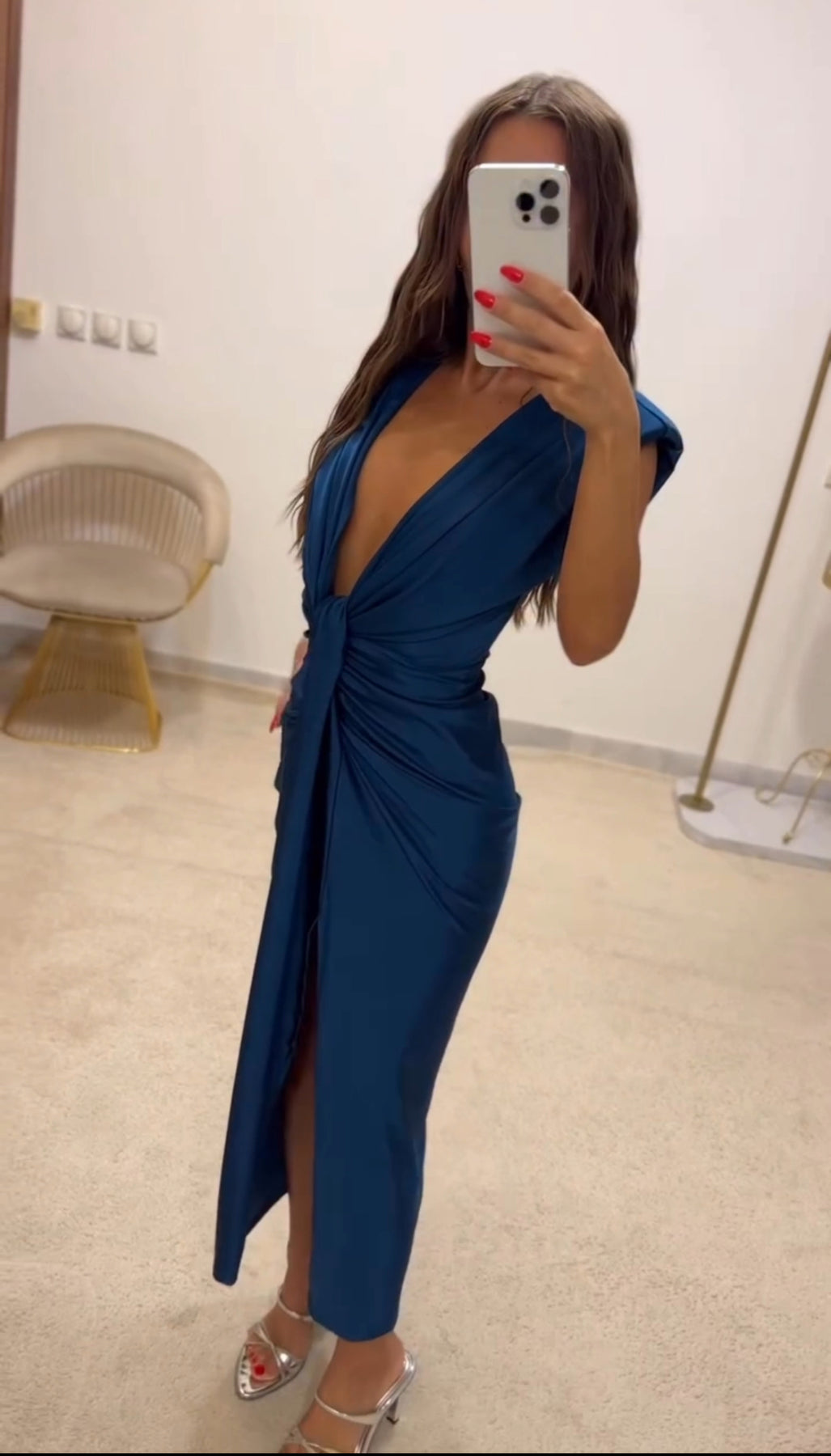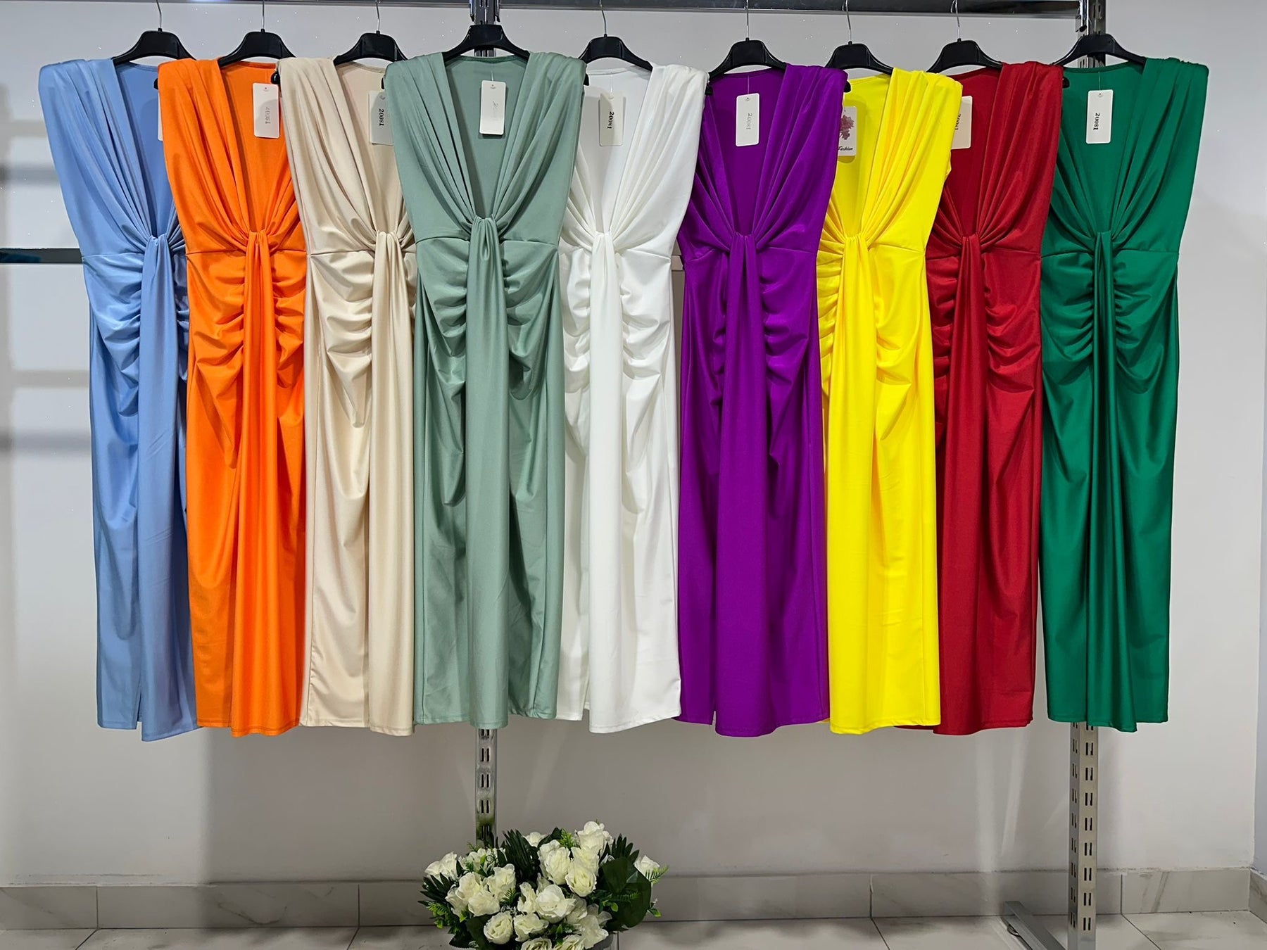Abito effetto raso lucido,taglia unica,strech in tanti colori,spallina e scollatura frontale con finto nodo anteriore e spacco