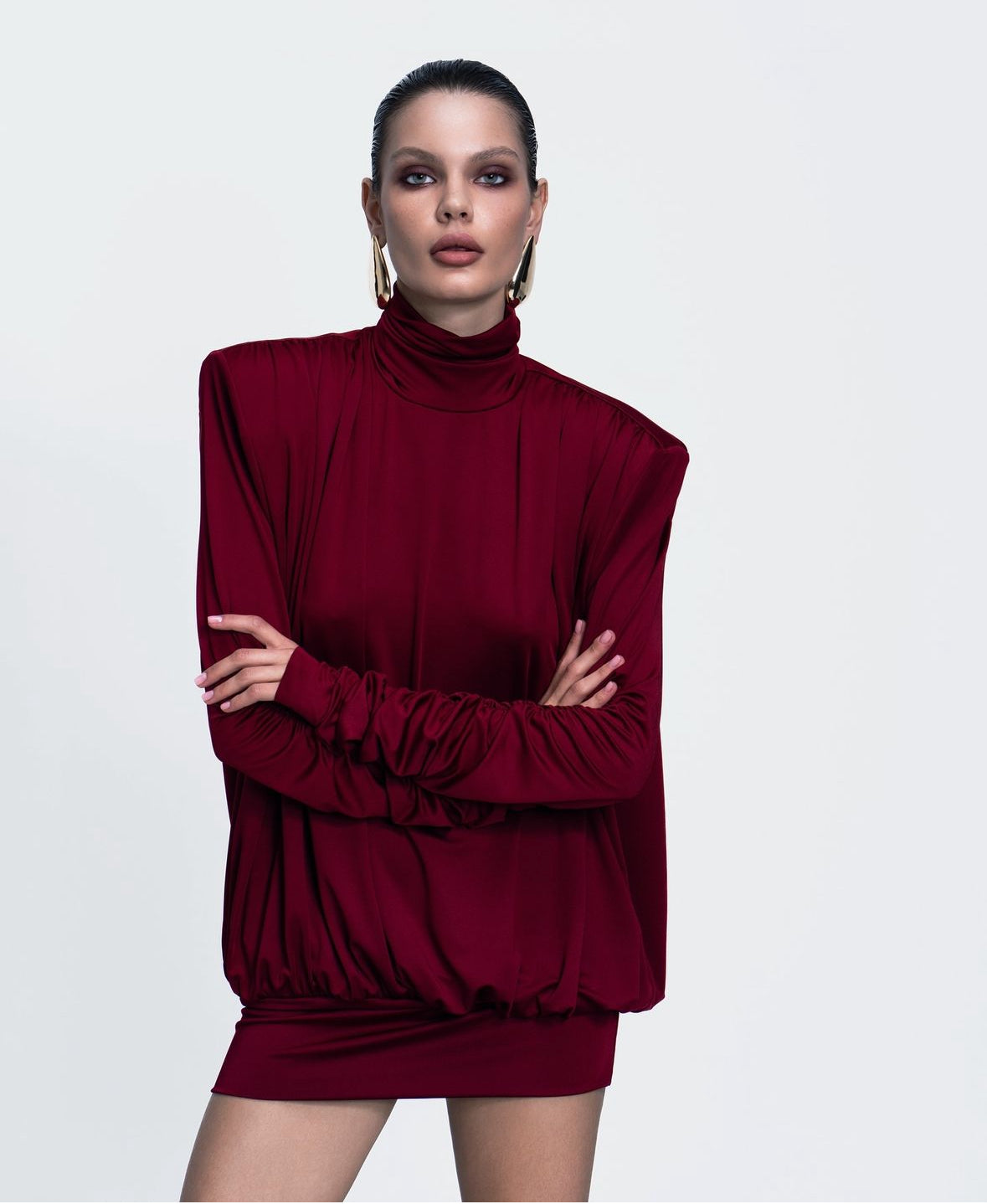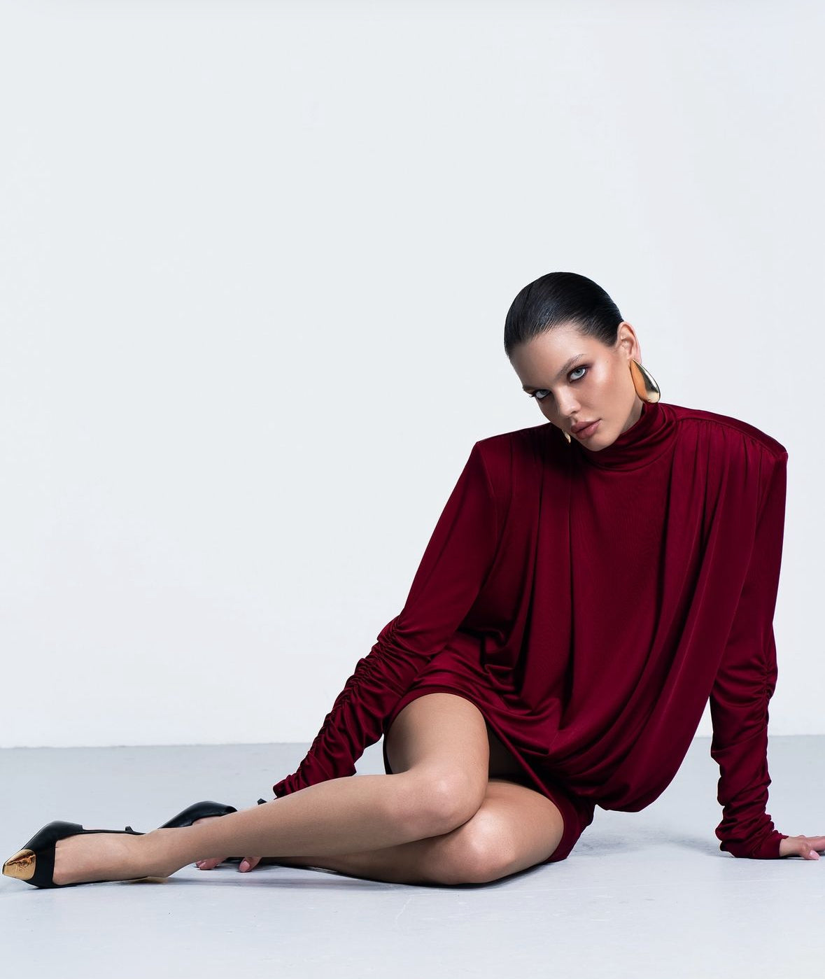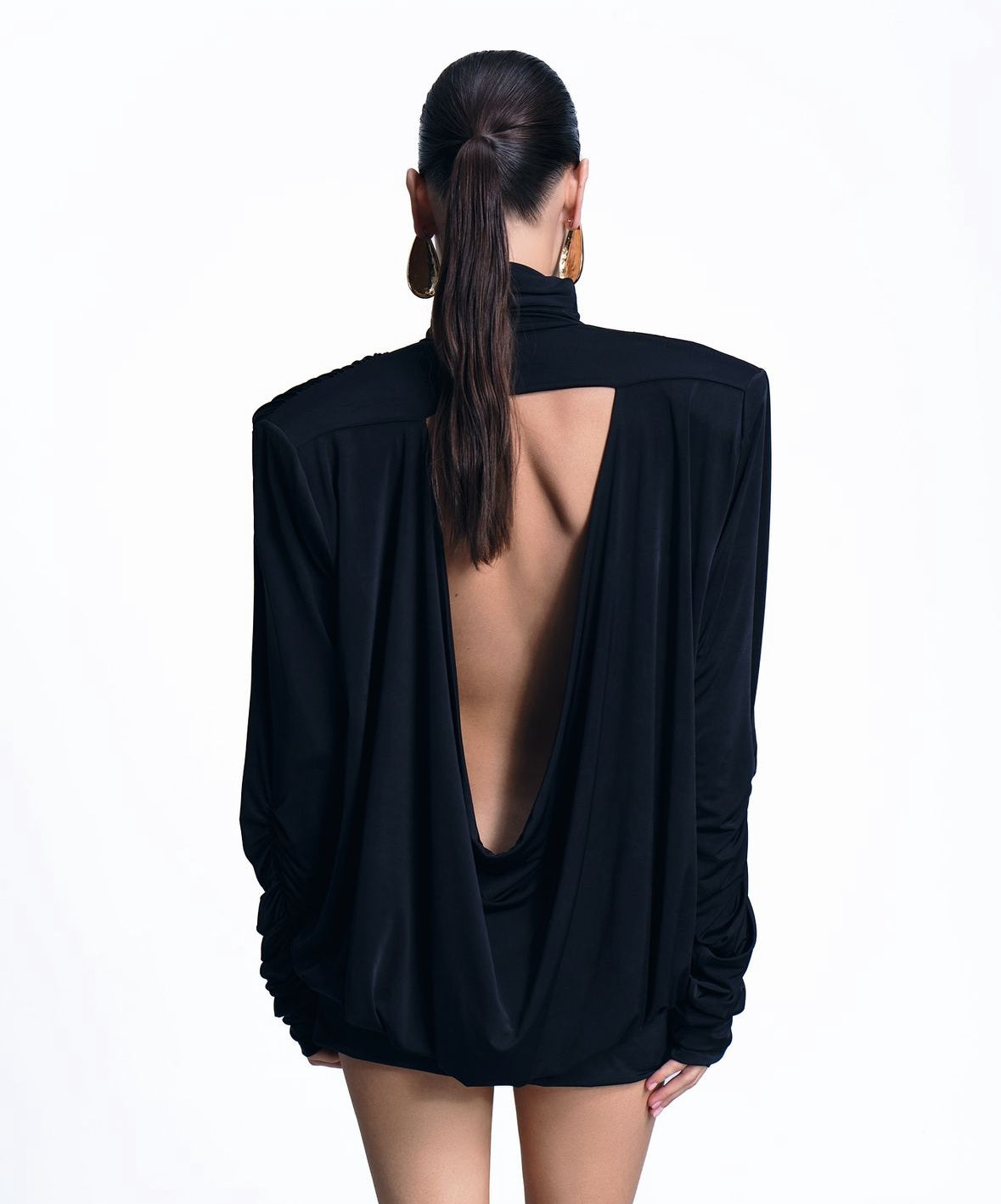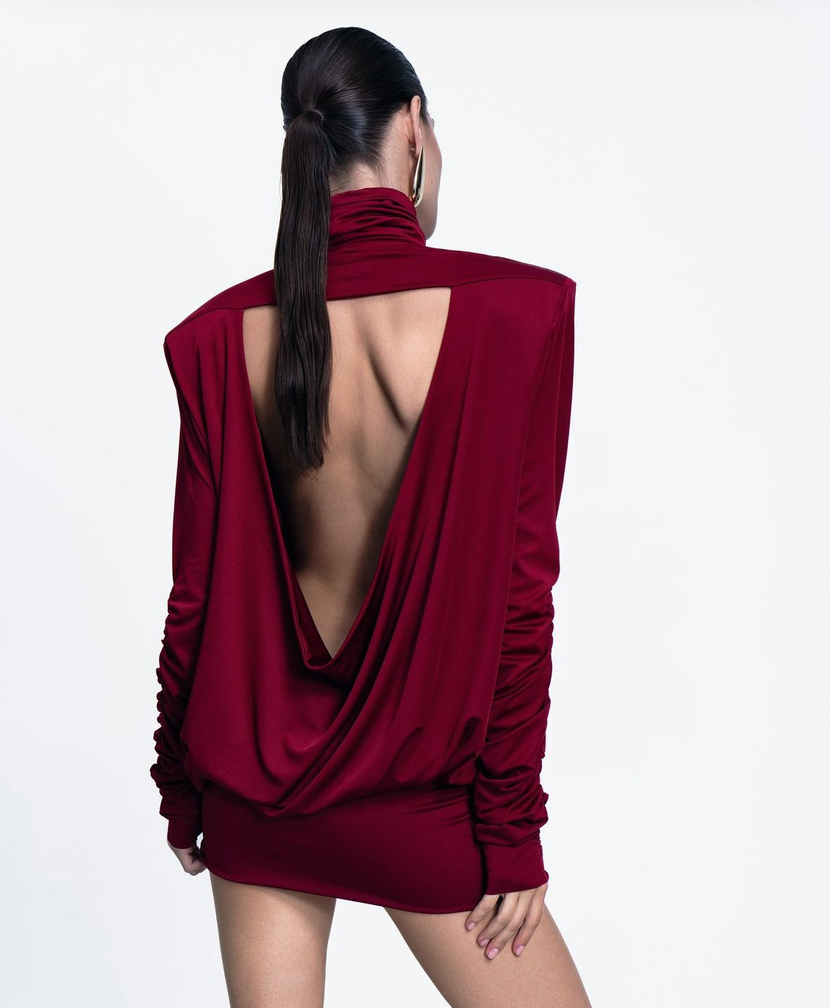 Tres Chic,questo abito si presenta in taglia unica sia in BORDEAUX che in NEROe MARRONE,mezzo collo in tessuto tecnico morbido,con ampia scollatura posteriore,scopre completamente la schiena,manica arricciata sui polsi