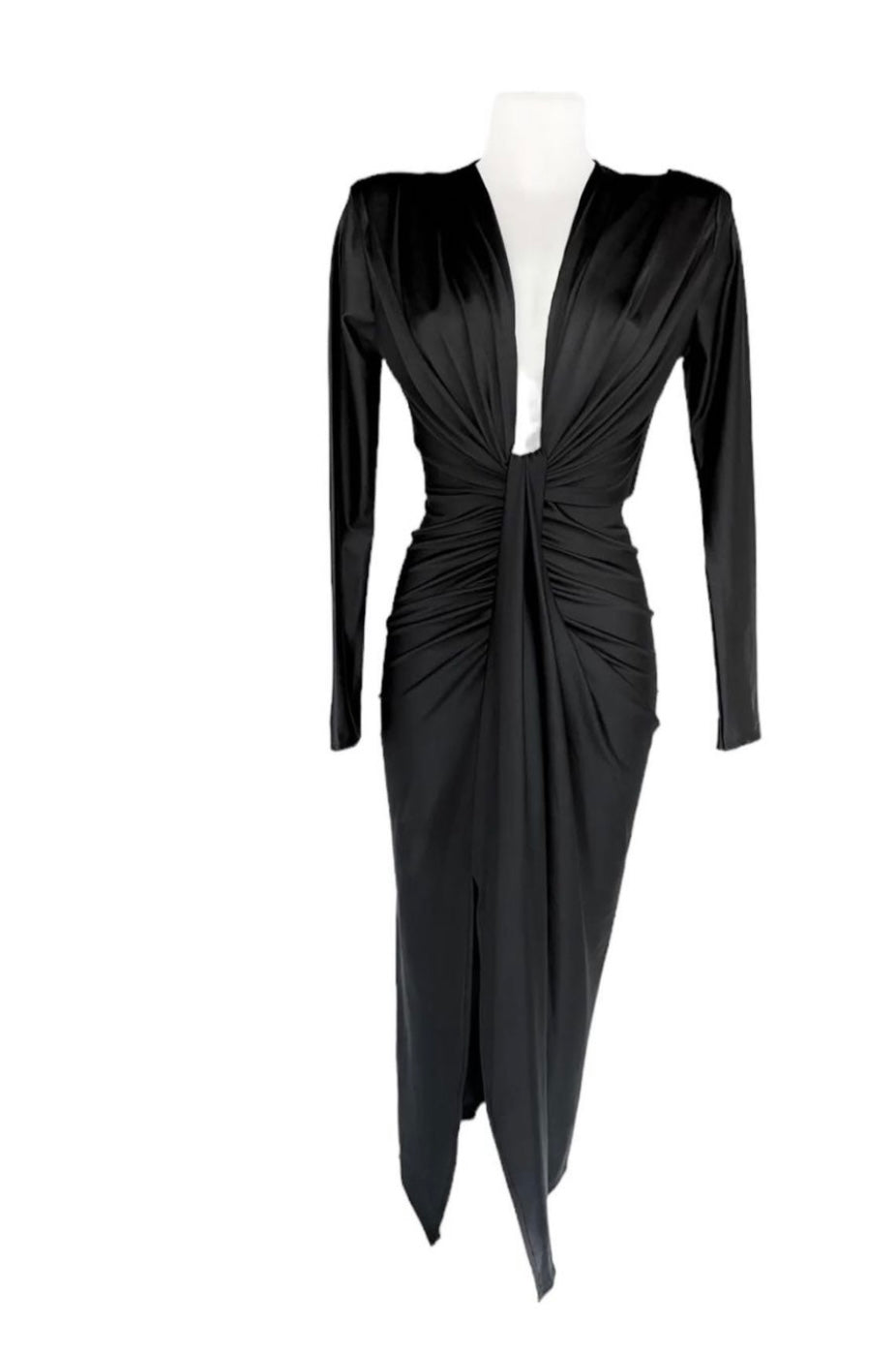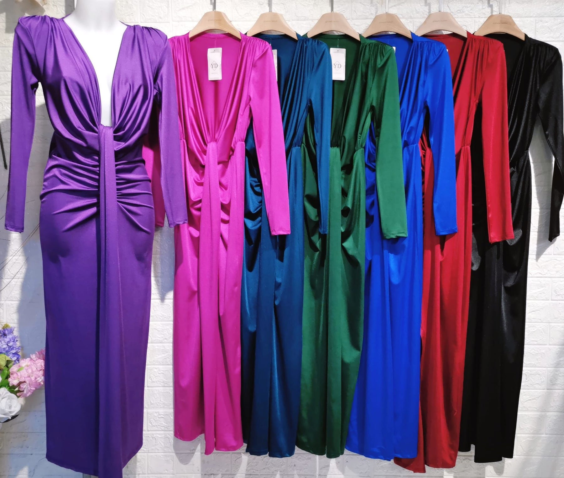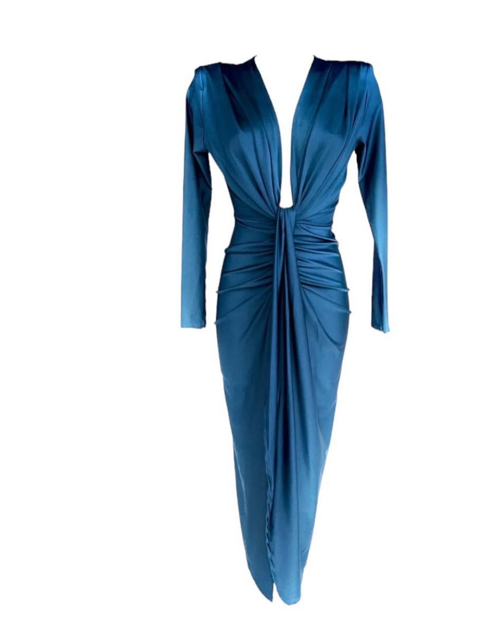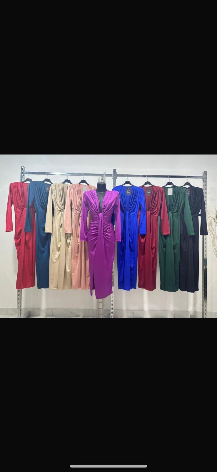L'abito Zaira è perfetto per le occasioni speciali grazie alla sua manica lunga in raso stretch e alla scollatura profonda con nodo e spacco frontale. Disponibile in vari colori per un look elegante e raffinato.