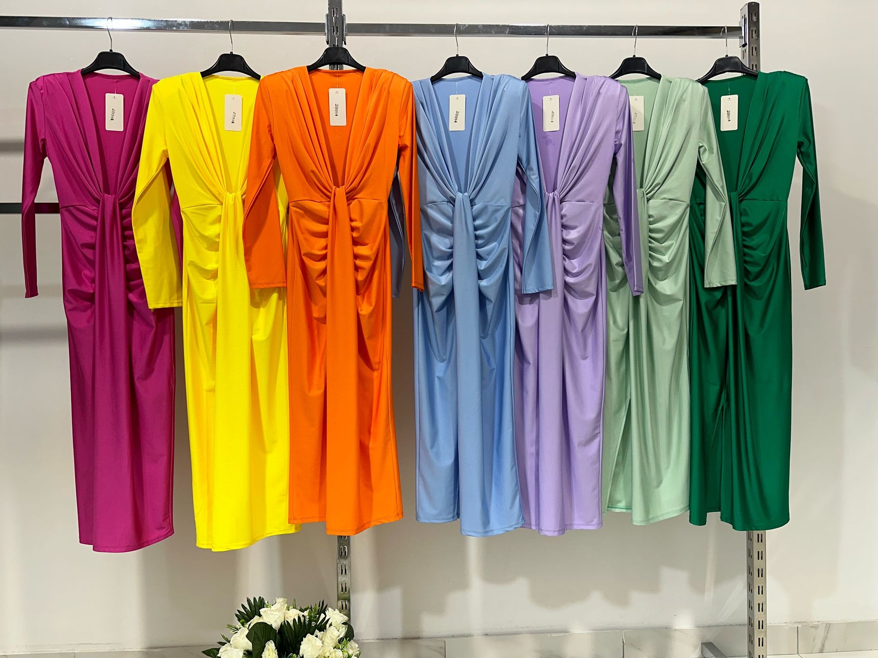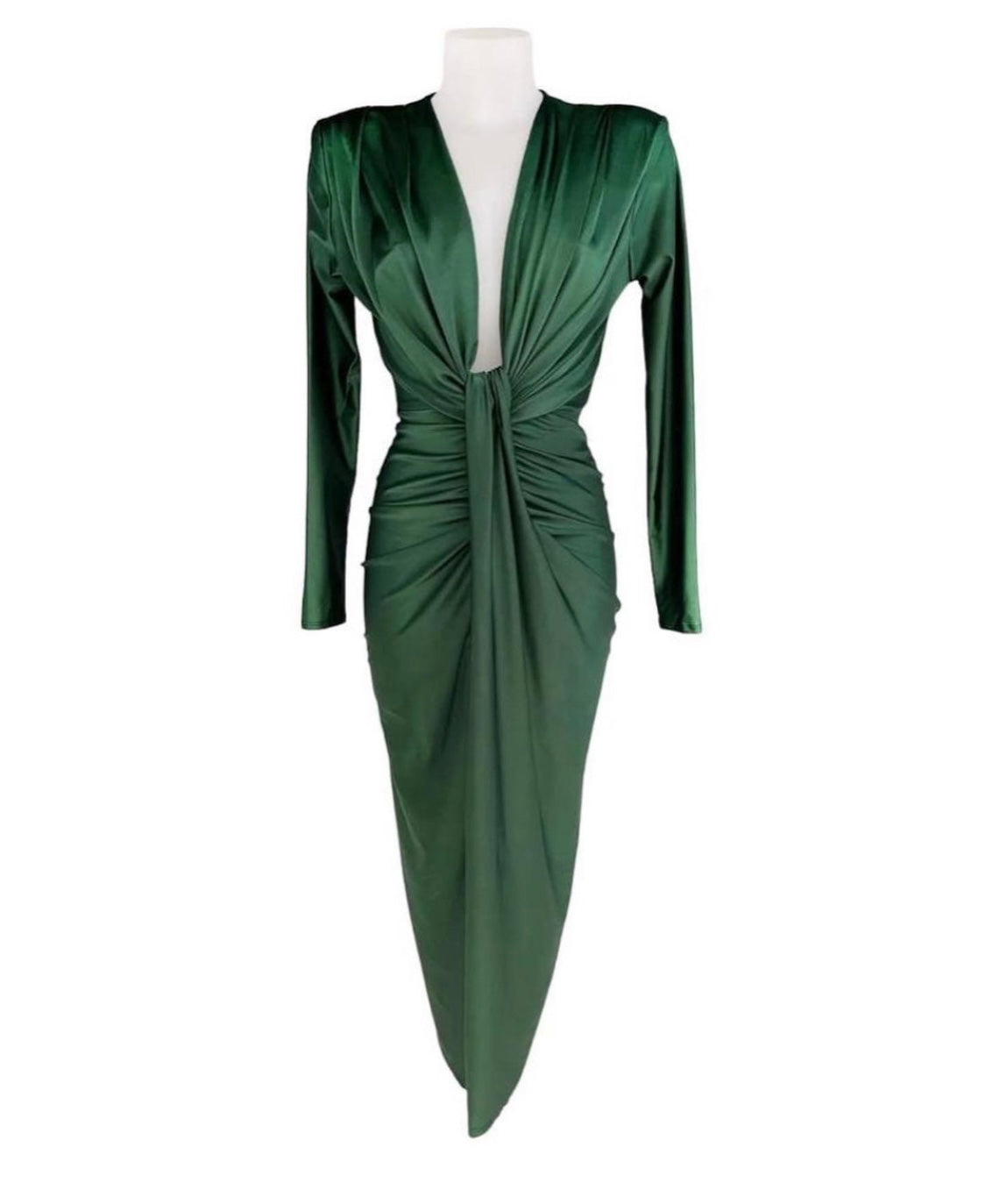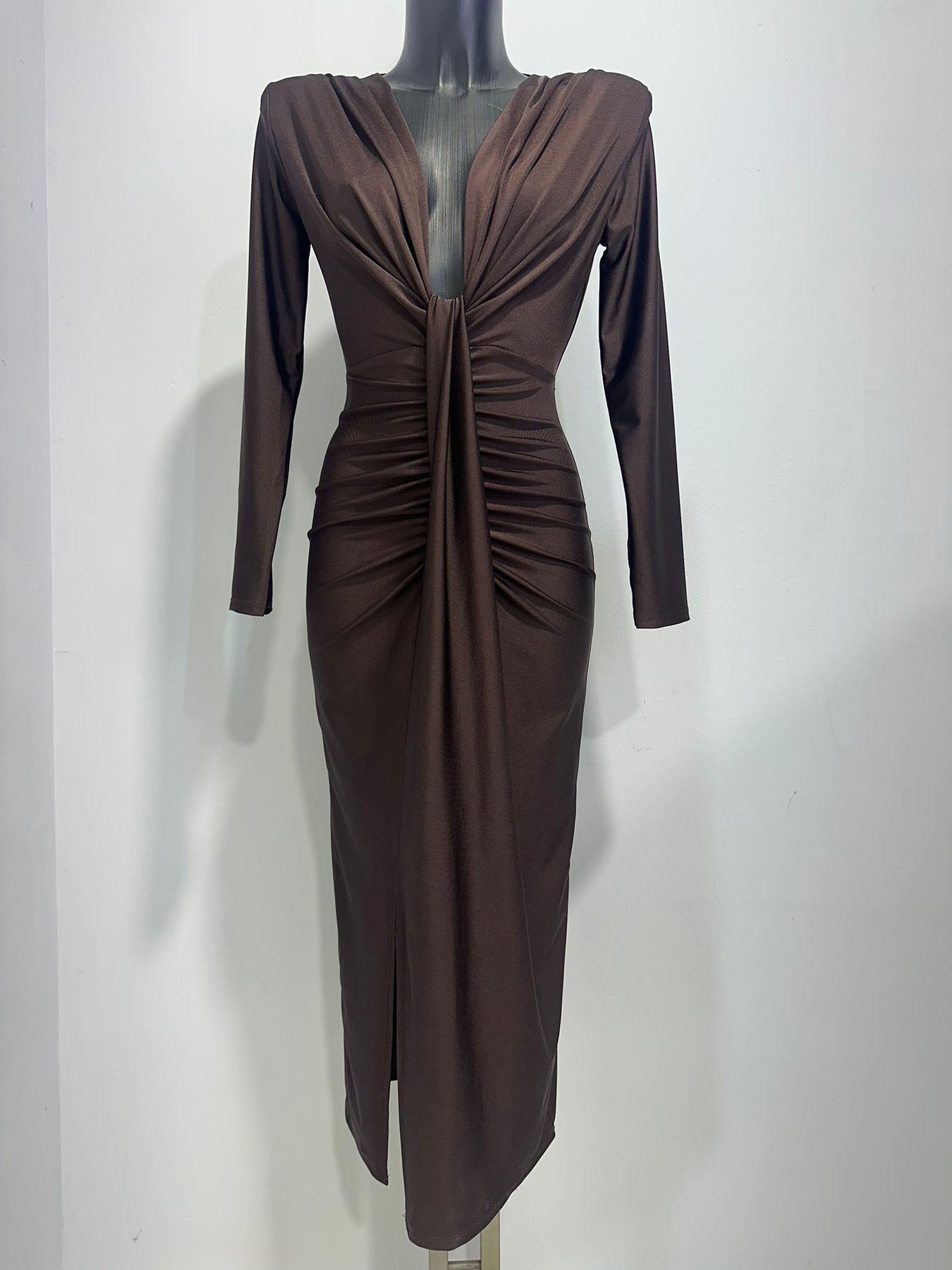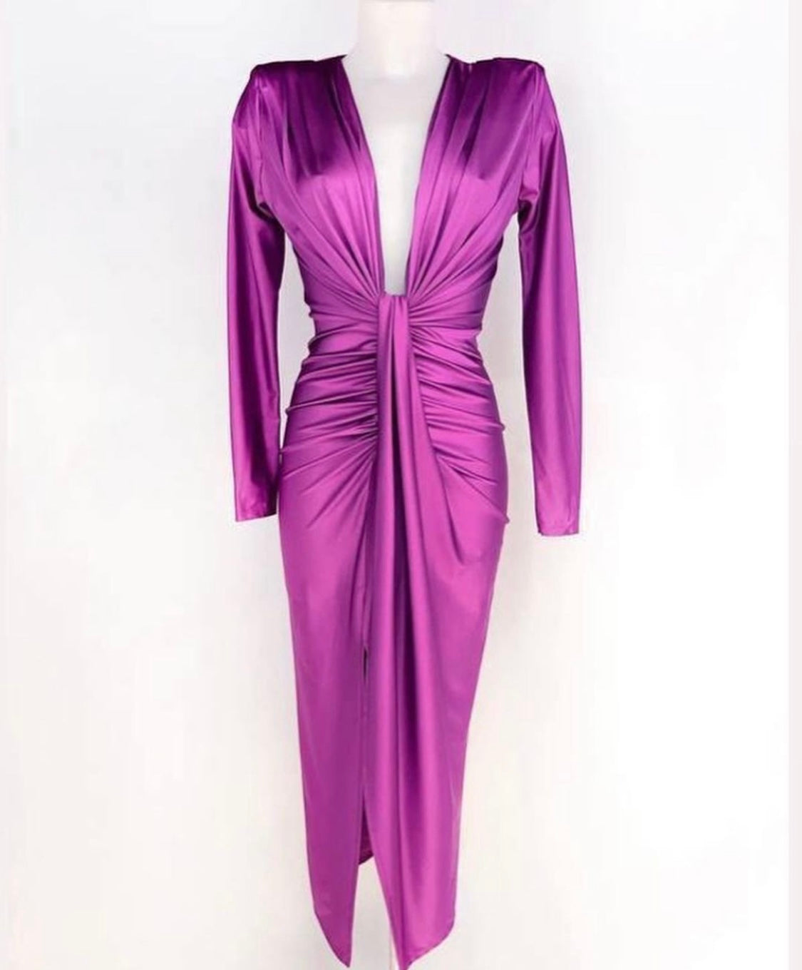 L'abito Zaira è perfetto per le occasioni speciali grazie alla sua manica lunga in raso stretch e alla scollatura profonda con nodo e spacco frontale. Disponibile in vari colori per un look elegante e raffinato.