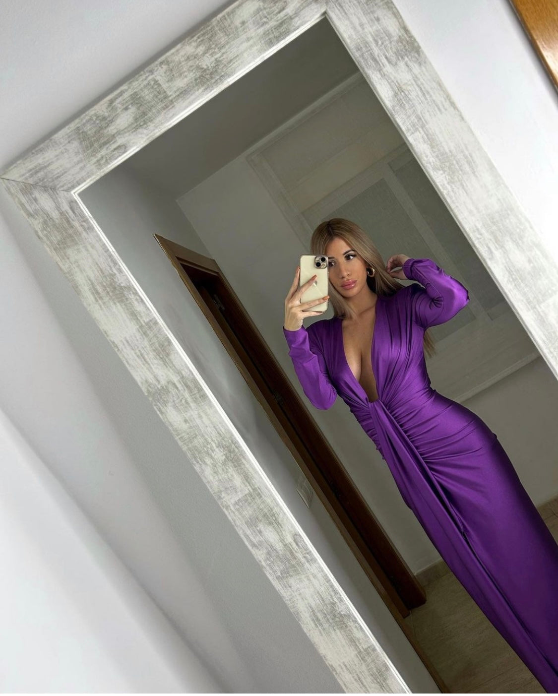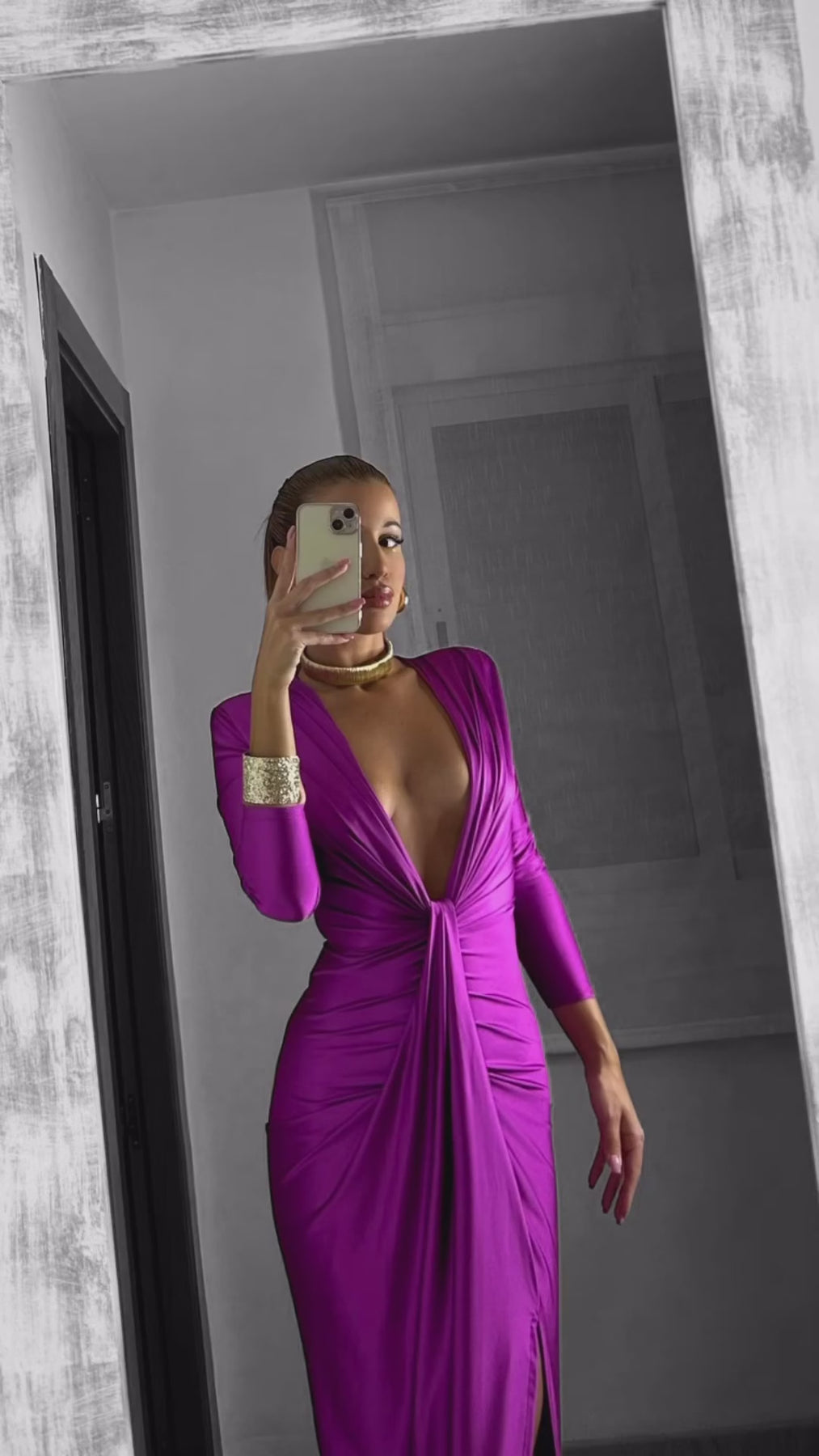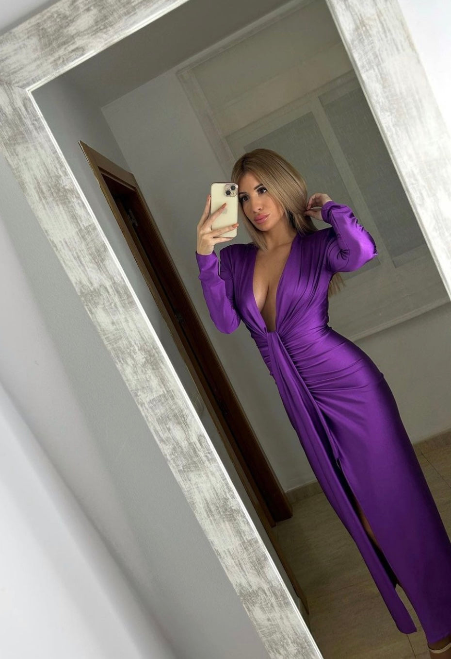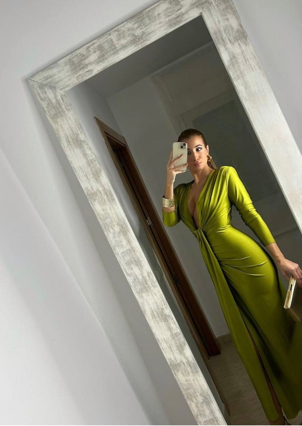 L'abito Zaira è perfetto per le occasioni speciali grazie alla sua manica lunga in raso stretch e alla scollatura profonda con nodo e spacco frontale. Disponibile in vari colori per un look elegante e raffinato.