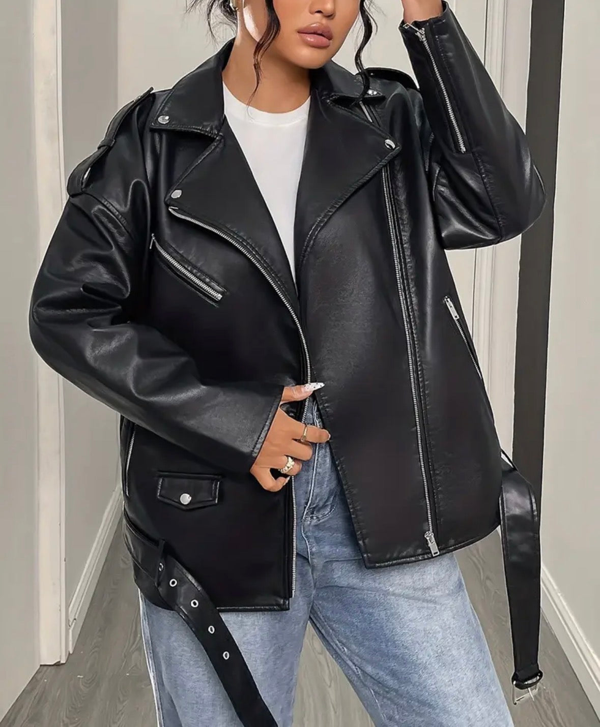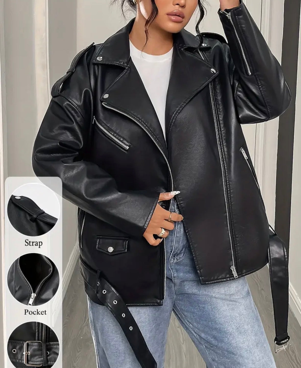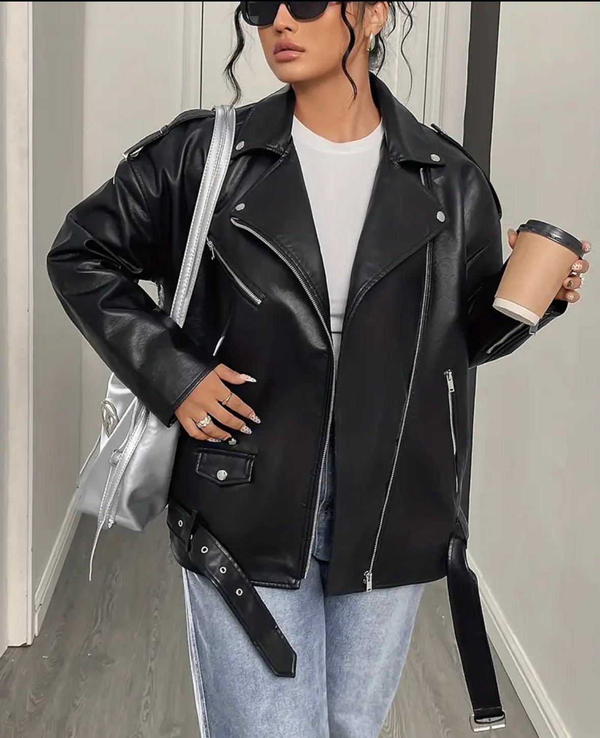 Questo chiodo MARIANNA è la taglia unica perfetta(OVERSIZE) per tutte le occasioni. Dotato di zip e bottoni in argento, ti offre un design elegante ed essenziale. La cintura finale e il doppio petto ti donano una silhouette slanciata. Stile e funzionalità in un unico capo.