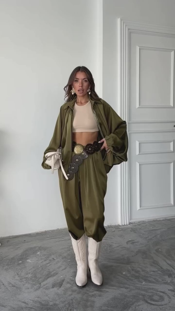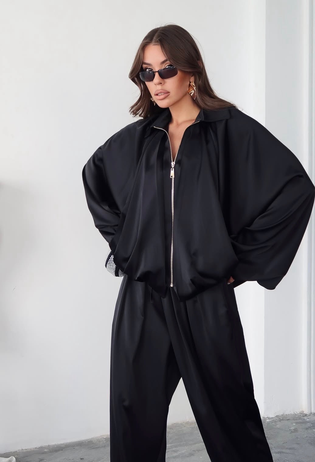 Il cordinato ALFA è perfetto per chi ama il comfort senza rinunciare allo stile. La taglia unica OVERSIZE garantisce una vestibilità comoda e adatta anche per chi indossa una XL. Il giubbetto con collo revers, zip anteriore e maniche larghe, insieme ai pantaloni palazzo con elastici in vita, creano un look unico e alla moda.