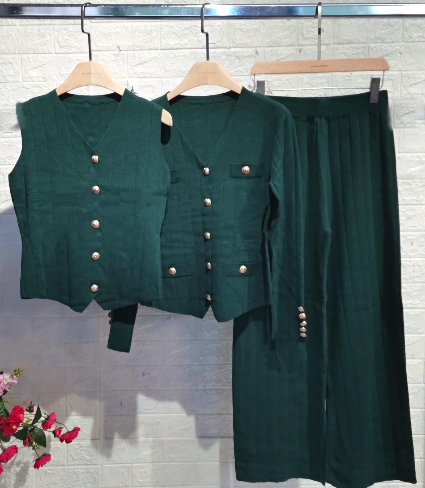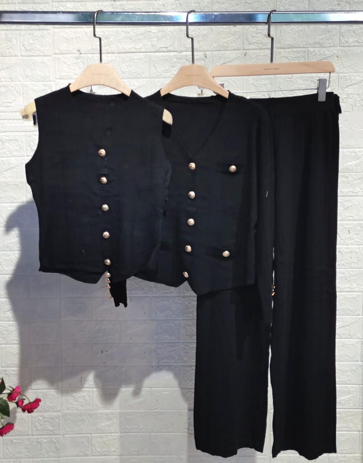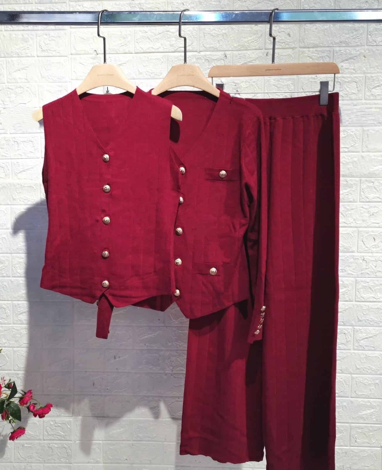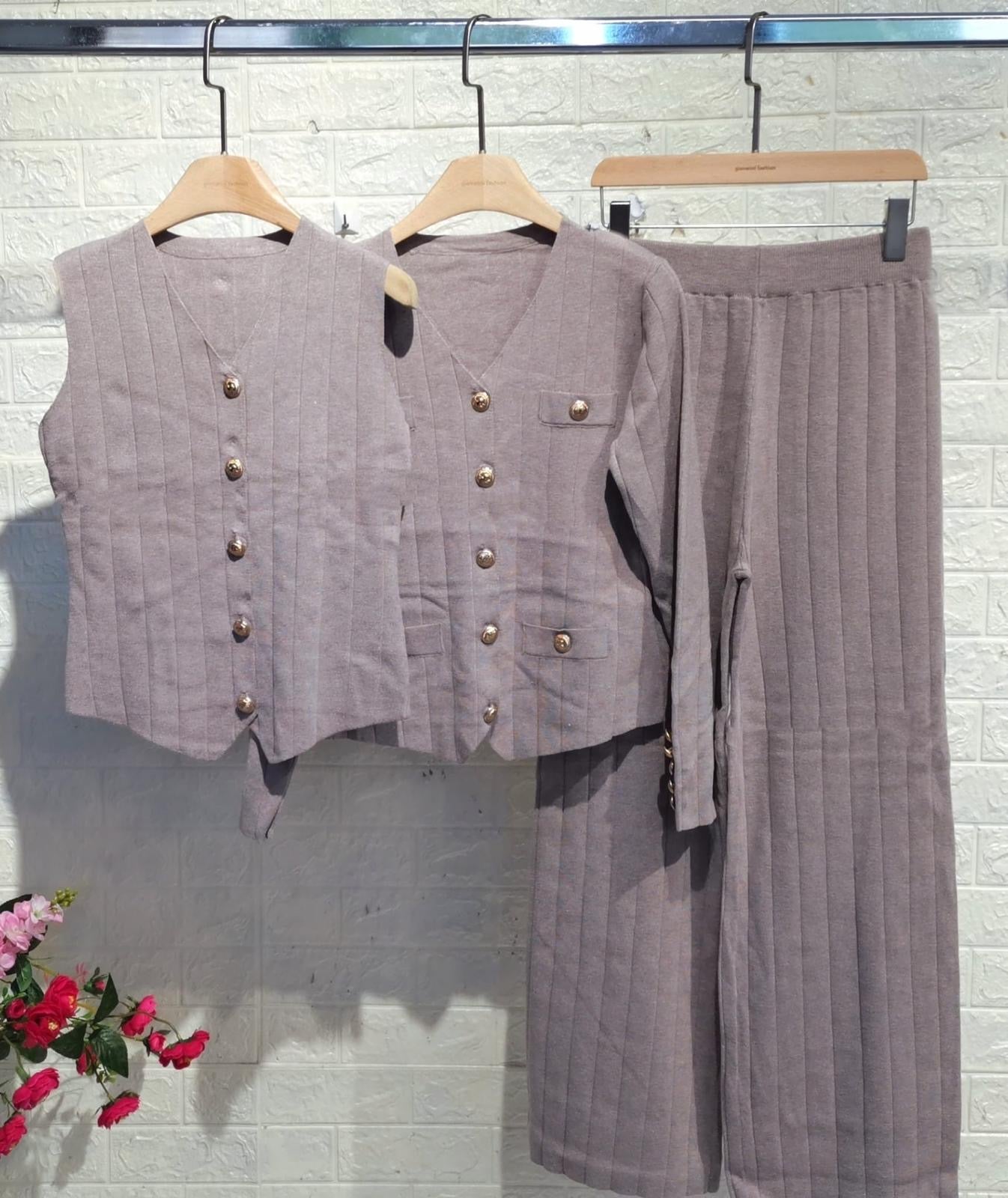 Il Cordinato MEGAN è composto da tre pezzi, taglia unica e disponibile in vari colori. Il gardigan corto con bottoni, il gilet con bottoni e i pantaloni palazzo con elastico in vita offrono una vestibilità comoda e versatile. Ideale per creare diversi look con un solo acquisto.